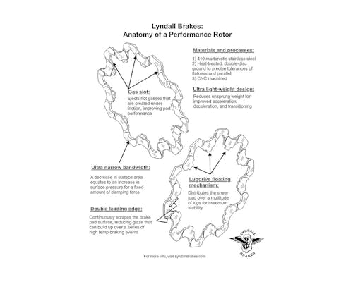 「LYNDALL:リンドール」はカリフォルニア発祥のブレーキプロダクトのプレミアムブランドです。 リンドールが誇るマテリアルであるブレーキローターは、 CNC加工され熱処理された410ステンレス鋼(マルテンサイト系)を使用し超軽量、 かつ高剛性でバネ下重量を減らし、リニアなレスポンスとブレーキング力を持ち合わせます。 さらに、 ■ラグドライブフローティング 熱伝導の遮断、ブレーキングの安定性を最大化するため、 多数のラグ(ピン)に負荷を分散。 ■ガススロット 摩擦により発生する高温ガスを排出し、パッドの性能を向上させます。 ■ウルトラナローバンド 通常のローターよりも表面積を減少させ、一定のクランプ力での表面圧力の増加に相当します。 ■ダブルリーディングエッジ ブレーキパッドの表面を継続的に削り、高温下の化学変化により発生する物質の発生を抑えます。 これらの特徴的な加工により既存のローターの枠に捉われない ハイスペックかつ独創的なデザインを持つ至極のプレミアム・ローターとなっています。 |