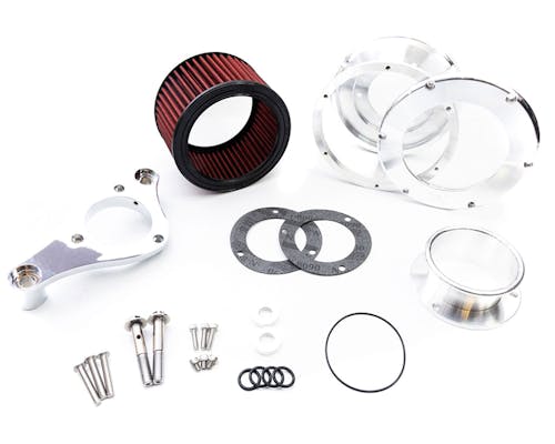 Feuling BAエアクリーナーは、内部にファンネル(ベロシティスタック)を設け、 インテークを長くし吸気流速を高めることで、 馬力・トルクの大幅な向上を見込むことが可能です。 ブローバイの機構が一体となったバックプレートを使用し、 別途フィルター類を設けないことで、一体型だからこそのスッキリとした見た目を実現。 また、再利用が可能な湿式エレメントを採用し、 メンテナンス性と機能性を併せもったキットとなっています。 その中でも"Race Series"は、元々バガーレースのエンジン用に設計されたもの。 通常のBAエアクリーナーと比べエレメントが約1インチほど厚く、30%もSIZE UPしています。 バガーレースにも参戦しているフューリングが送り出す、 レースパフォーマンスのハイフローエアクリーナーがついに上陸!! "Run the Best or Choke with the Rest" |