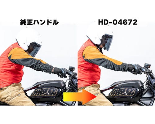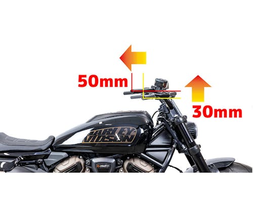 斬新で新たなスタイルを提示するスポーツスターSを乗りやすくする モデル専用フィフティーバーハンドルが登場! 50mm手前にバック、30mmアップすることで腕の張りが減り乗りやすくなります。 |
