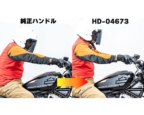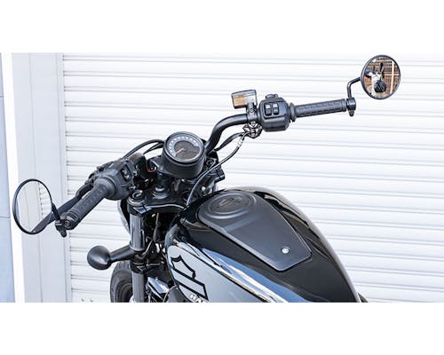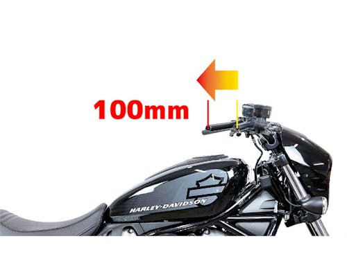 空冷スポーツスターを踏襲するデザインの新型ナイトスターを乗りやすくする モデル専用ハンドルバーが登場! 乗りやすさを追求した結果、100mmバックの形状に到達。 従来のフィフティーバーという数値にとらわれずに快適に乗れるスタイルを実現。 グリップの位置を自然なポジションで考え、少し絞り角をきつく100mm手前にバックさせることで 腕の張りが減り、無理せず乗れる形状を追求しました。 |
