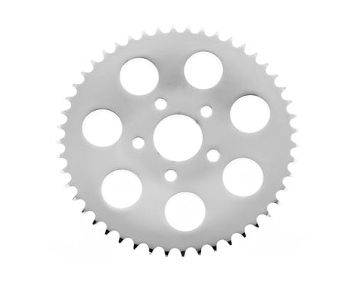 クロームのリアスプロケットです。 リアスプロケットは丁数が多いほど加速(トルク)重視、少ないと伸び(最高速)重視になります。 トランススプロケットとの組み合わせで調整できますので、お好みの調整をどうぞ。 |