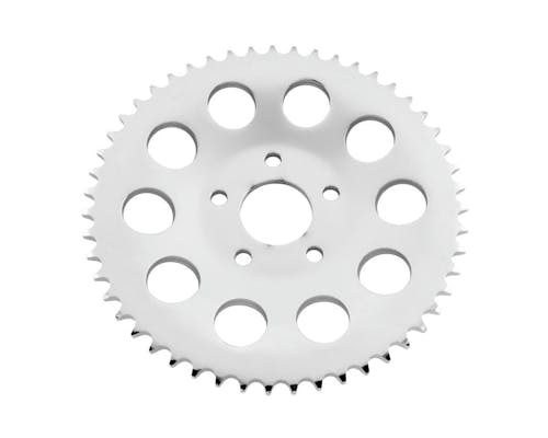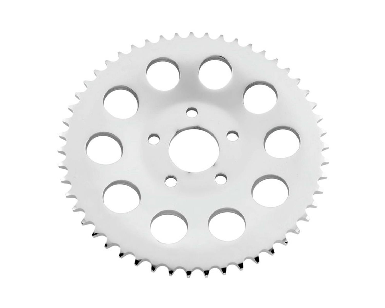 クロームのリアスプロケットです。 リアスプロケットは丁数が多いほど加速(トルク)重視、少ないと伸び(最高速)重視になります。 トランススプロケットとの組み合わせで調整できますので、お好みの調整をどうぞ。 |