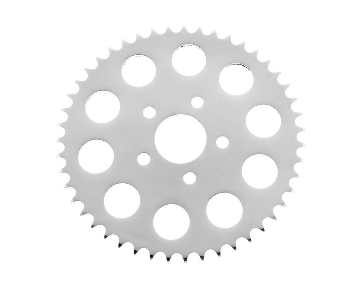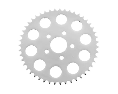 クロームのリアスプロケットです。 リアスプロケットは丁数が多いほど加速(トルク)重視、少ないと伸び(最高速)重視になります。 トランススプロケットとの組み合わせで調整できますので、お好みの調整をどうぞ。 |