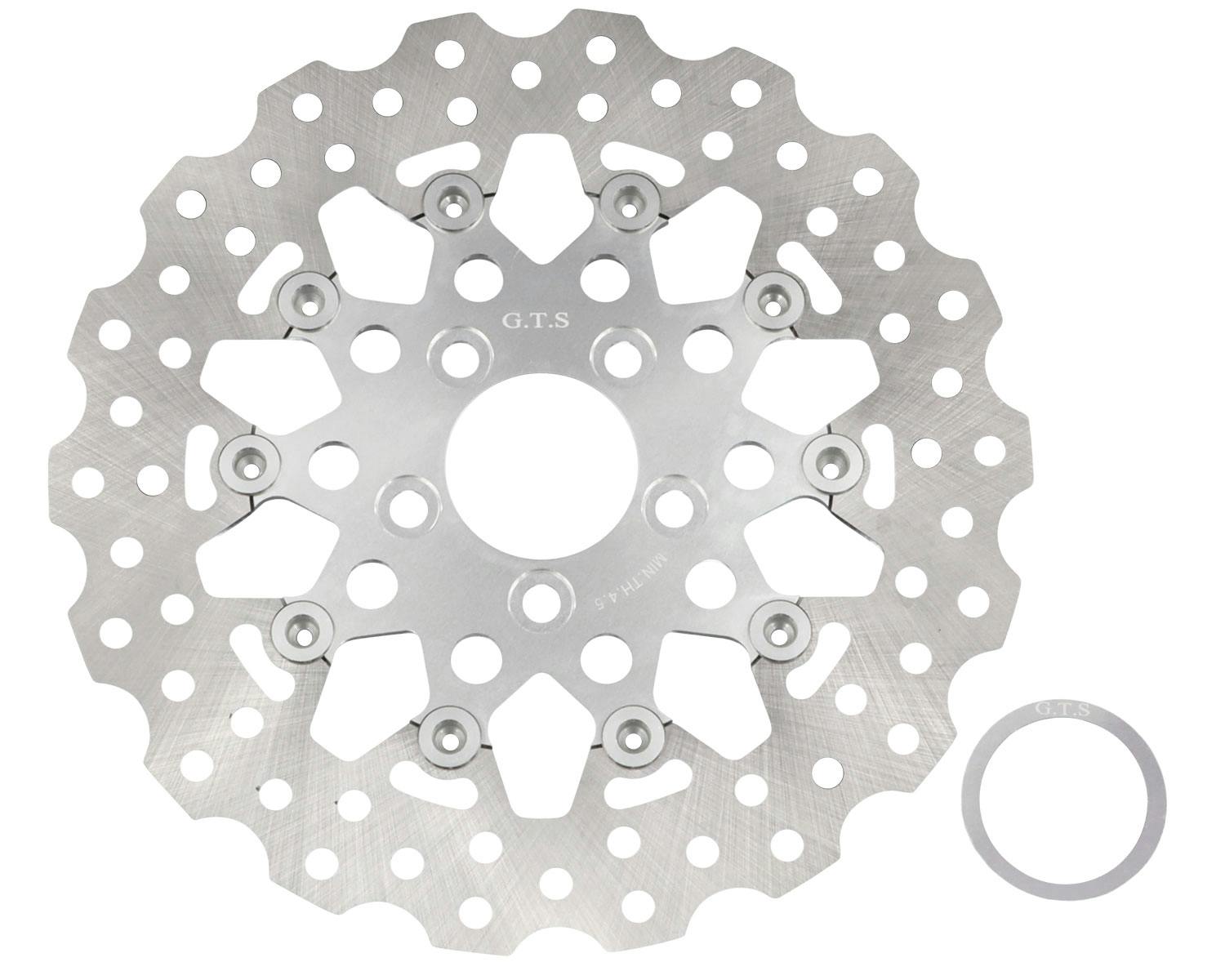 GTSのフローティングディスクローターです。 アウターローターがウェーブカットされている為、 見た目も制動力もアップ! フローティングローターはリジット固定に比べ、 ロータに生じる車軸方向の応力が軽減されるため、熱変形が抑えられる他、 ハブやホイールに伝わる熱を軽減させるなど、メリットが豊富です。 レーザーカット加工で精密に仕上げられ、 軽量化のためインナーとコネクトピンはアルミが使われています。 |