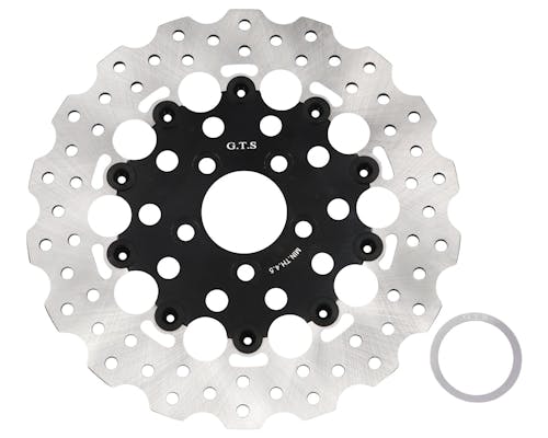 GTSのフローティングディスクローターです。 アウターローターがウェーブカットされている為、 見た目も制動力もアップ! フローティングローターはリジット固定に比べ、 ロータに生じる車軸方向の応力が軽減されるため、熱変形が抑えられる他、 ハブやホイールに伝わる熱を軽減させるなど、メリットが豊富です。 レーザーカット加工で精密に仕上げられ、 軽量化のためインナーとコネクトピンはアルミが使われています。 |
