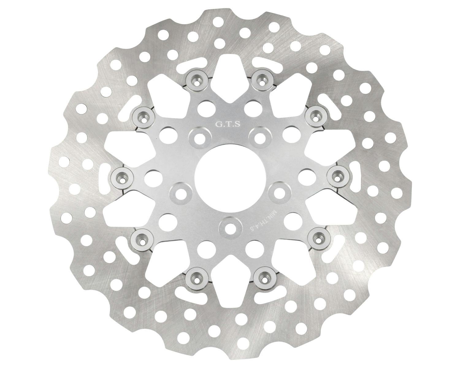 GTSのフローティングディスクローターです。 アウターローターがウェーブカットされている為、 見た目も制動力もアップ! フローティングローターはリジット固定に比べ、 ロータに生じる車軸方向の応力が軽減されるため、熱変形が抑えられる他、 ハブやホイールに伝わる熱を軽減させるなど、メリットが豊富です。 レーザーカット加工で精密に仕上げられ、 軽量化のためインナーとコネクトピンはアルミが使われています。 |