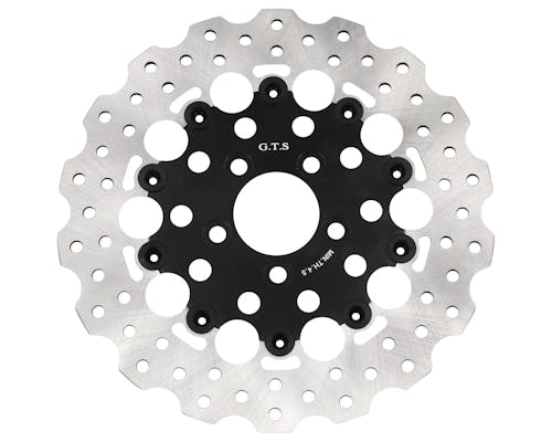 GTSのフローティングディスクローターです。 アウターローターがウェーブカットされている為、 見た目も制動力もアップ! フローティングローターはリジット固定に比べ、 ロータに生じる車軸方向の応力が軽減されるため、熱変形が抑えられる他、 ハブやホイールに伝わる熱を軽減させるなど、メリットが豊富です。 レーザーカット加工で精密に仕上げられ、 軽量化のためインナーとコネクトピンはアルミが使われています。 |