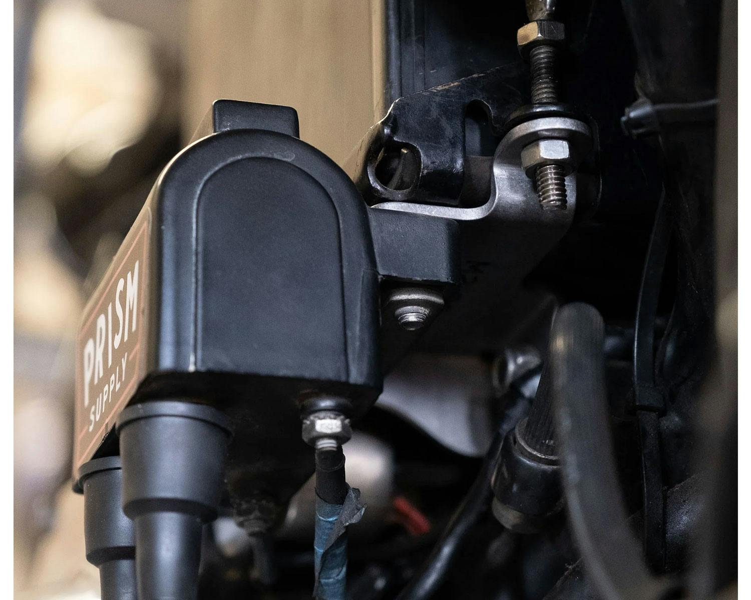 コイルをバッテリー下へ移設できるブラケットです。 シリンダー横へメーターを移設する際や、エンジン周りをスッキリさせたい時に。 取り付けた時見えない部分にも"PRISM"の刻印が。ブランドのこだわりを感じる一品です。 プラグコードの長さ変更も必要になるので、コードのカラーを変更することで よりファッショナブルにご利用いただけます。 |