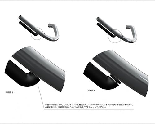 ※手曲げの公差により フロントバンクに純正サイレンサーのバイパスパイプが干渉する場合があります。 必要に応じて、『詳細図B』のようにバイパスパイプをカットして下さい。 ※レース専用品、公道走行不可。 装着に際し、その他加工や工夫が伴う場合がございます。 予めご了承下さい。 |