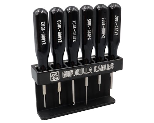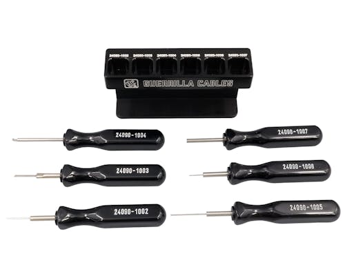 ターミナルのリリースに重宝する専用ツール&ホルダーのセットです。 ホルダーはマグネット付きで マグネット付きで工具箱やリフトに取り付ける事ができます。 リリースツールは専用設計なのでカプラーを痛めにくく、 端子の分解作業を効率よく進めることが可能になります。 使用時はツールの尖った方を端子側に向けて、リリース穴へ真っ直ぐ差し込みます。 奥まで差し込んだら、あとは配線を軽く引いて抜きます。 端子は真っ直ぐ抜き差ししないと途中で引っかかります。ご注意ください。 |
