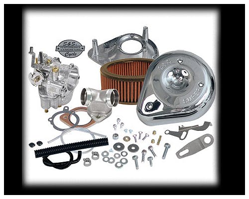 ハイパフォーマンスキャブとして有名なS&S、スーパーEキャブレターです。 その強烈で独特な加速感は病み付きになること間違いなし! またエアクリーナーの形状も人気が高く、CVキャブにもこのエアクリーナーを 付ける人がいるほどです。 |