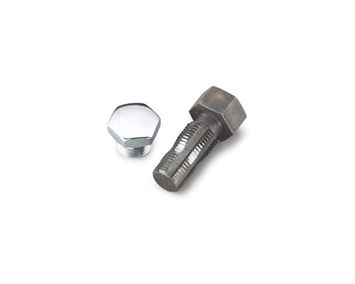 タップ付きのドーム型オーバーサイズドレーンプラグです。 傷んだ純正のホールをオーバーサイズ1/2-13にタップ調整し 新たなサイズのプラグを装着します。 |